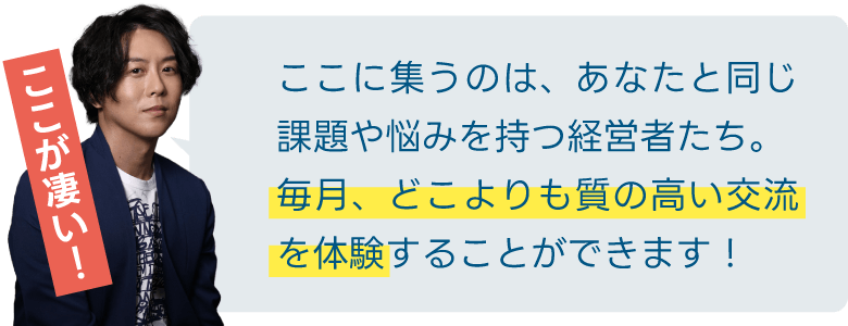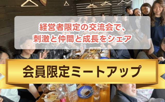 メンバー限定で毎月開催する交流会。美味しい食事を食べながら、他業種の成功施策に触れたり、自分の悩みを共有できたり、さらには仲間同士でジョイントベンチャーを計画したり、経営者ならではの質の高い時間を過ごすことができます。(飲食代は別途になります)