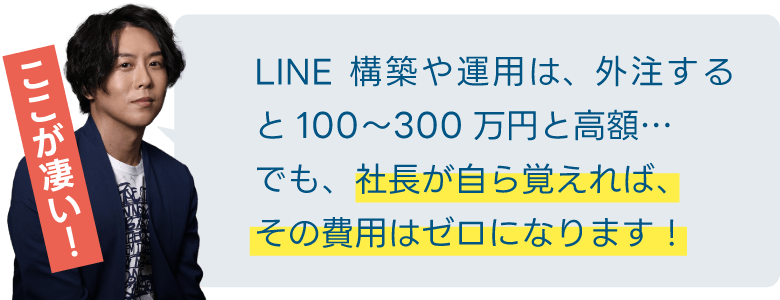 LINE構築や運用を外注すると、一般的に100〜300万円のコストがかかります。しかし、あなた自身がLINEマーケティングをマスターすれば、その費用はゼロです。